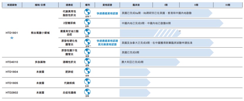 从最新的财报数据来看,公司核心产品为HTD1801,布局了酒精性脂肪性肝炎(NASH)、二型糖尿病、严重高甘油三酯血症、原发性硬化性胆管炎和原发性胆汁性胆管炎五大适应症。目前多个适应症处于II期临床或者完成II期临床,等待进入III期临床阶段。