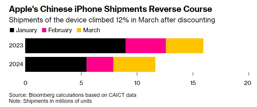 苹果iPhone在中国的出货量出现逆转——3月份,iPhone系列出货量在打折后增长约12%