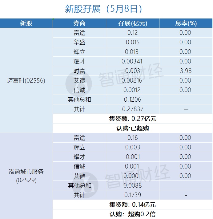 智通财经APP获悉,迈富时(02556)、泓盈城市服务(02529)正在招股中。截至5月8日,辉立、富途等券商合计分别为迈富时借出孖展0.27837亿港元,认购已超购;为泓盈城市服务借出孖展0.1739亿港元,认购超购0.2倍。