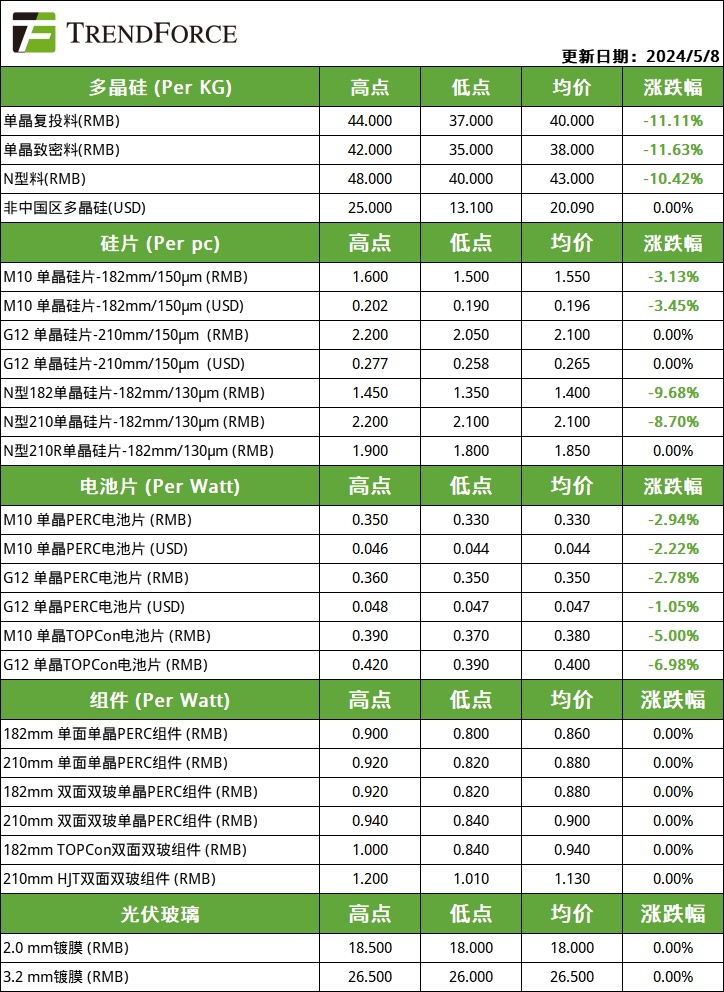 智通财经APP获悉,5月8日,根据TrendForce集邦咨询旗下新能源研究中心5月8日最新报价,单晶复投料主流成交价格为40元/KG,单晶致密料的主流成交价格为38元/KG,N型料报价43元/KG。硅料环节价格持续下行,跌幅均超10%。