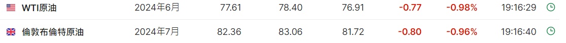 3. 截至发稿,WTI原油跌0.98%,报77.61美元/桶。布伦特原油跌0.96%,报82.36美元/桶。