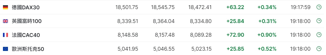 2. 截至发稿,德国DAX指数涨0.34%,英国富时100指数涨0.31%,法国CAC40指数涨0.90%,欧洲斯托克50指数涨0.52%。