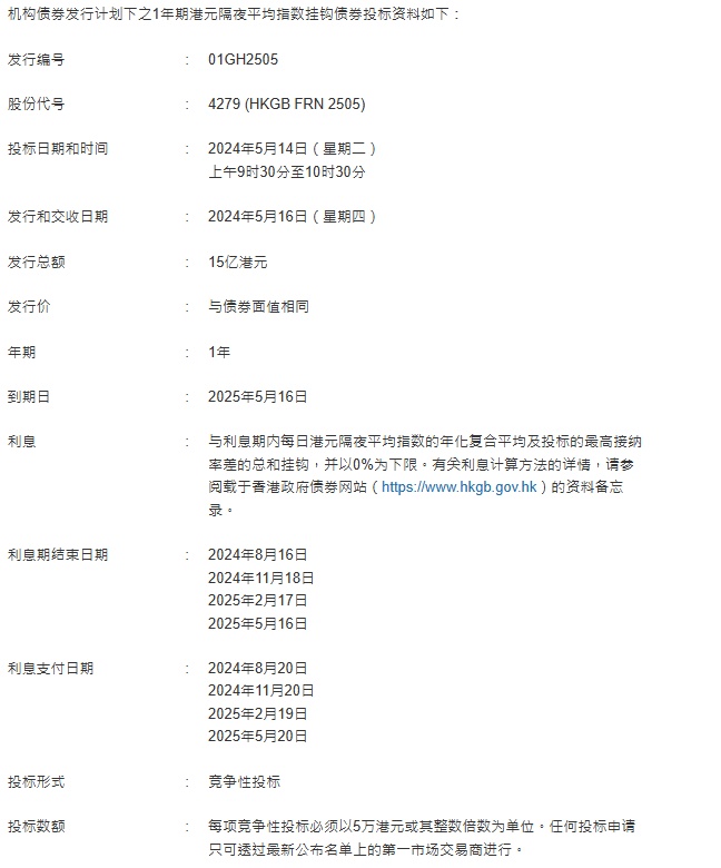 智通财经APP获悉,5月8日,香港金融管理局公告称,在机构债券发行计划下推出的1年期港元隔夜平均指数挂鈎债券(债券),将于2024年5月14日(星期二)进行投标,并于2024年5月16日(星期四)交收。总值15亿港元的1年期债券供投标。该批债券将于2025年5月16日期满,利率与港元隔夜平均指数挂鈎,每三个月派息一次。