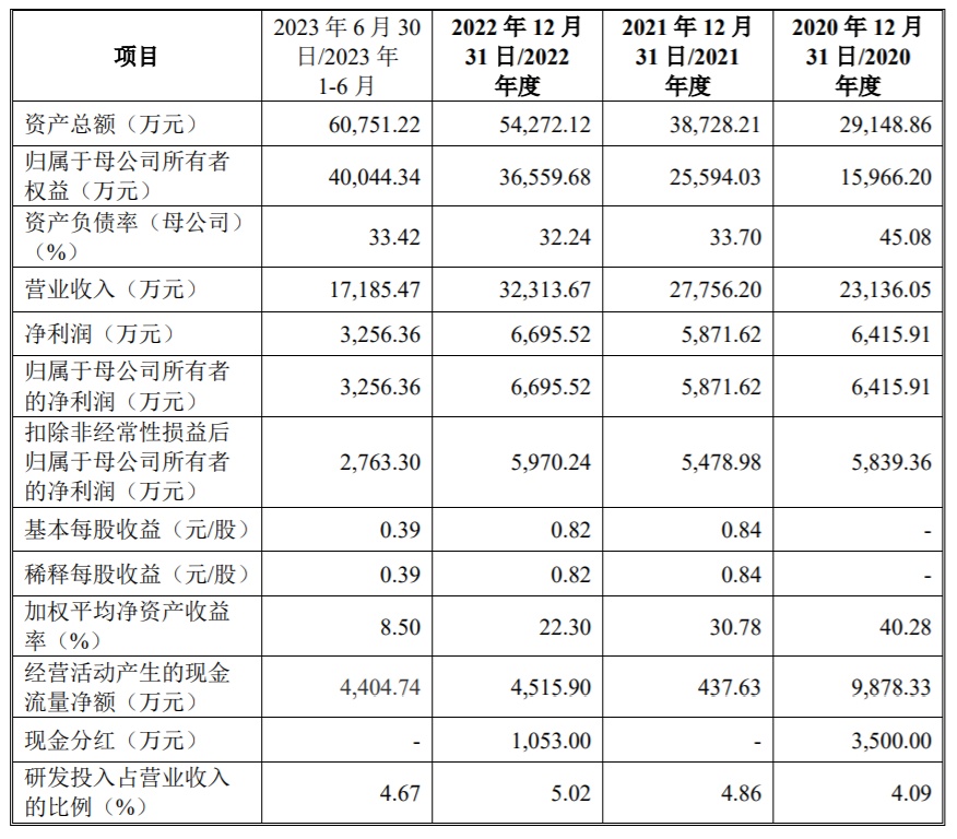 财务方面,2020年度、2021年度、2022年度、2023年1-6月,唐兴科技分别实现营业收入约2.31亿元、2.78亿元、3.23亿元、1.72亿元人民币;净利润分别为6415.91万元、5871.62万元、6695.52万元、3256.36万元人民币。