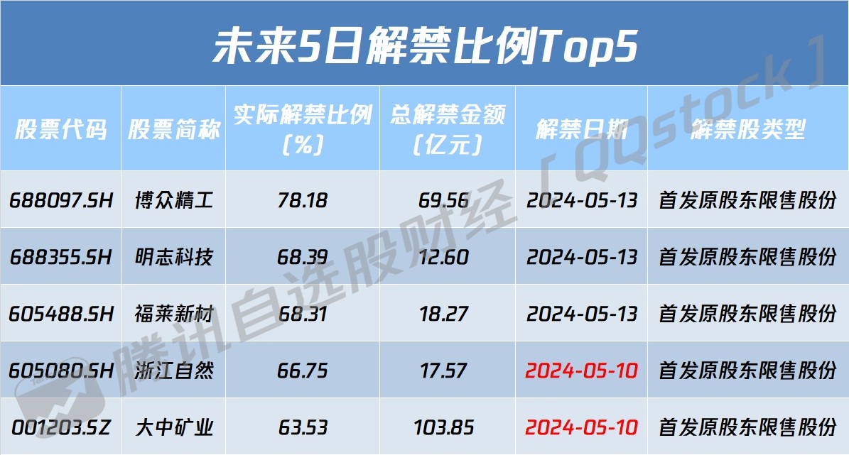 从解禁比例来看,未来5日博众精工实际解禁比例达78.18%,其次解禁比例居前的分别为明志科技、福莱新材。