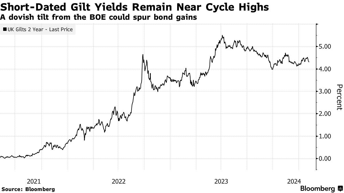 任何有关英国央行最早在6月降息的迹象都可能令英镑承压,并提振英国债券。今年早些时候,由于交易员不再押注英国央行将在2024年降息多达6次,英国债券遭到抛售,对货币政策敏感的两年期英国国债收益率在4.3%左右。