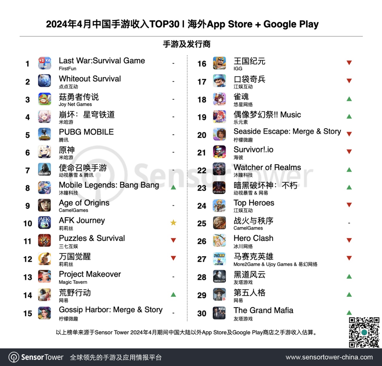Tower商店情报平台最新数据显示,2024年4月中国手游产品在海外市场收入及下载量排行榜出炉,FirstFun《Last War:Survival