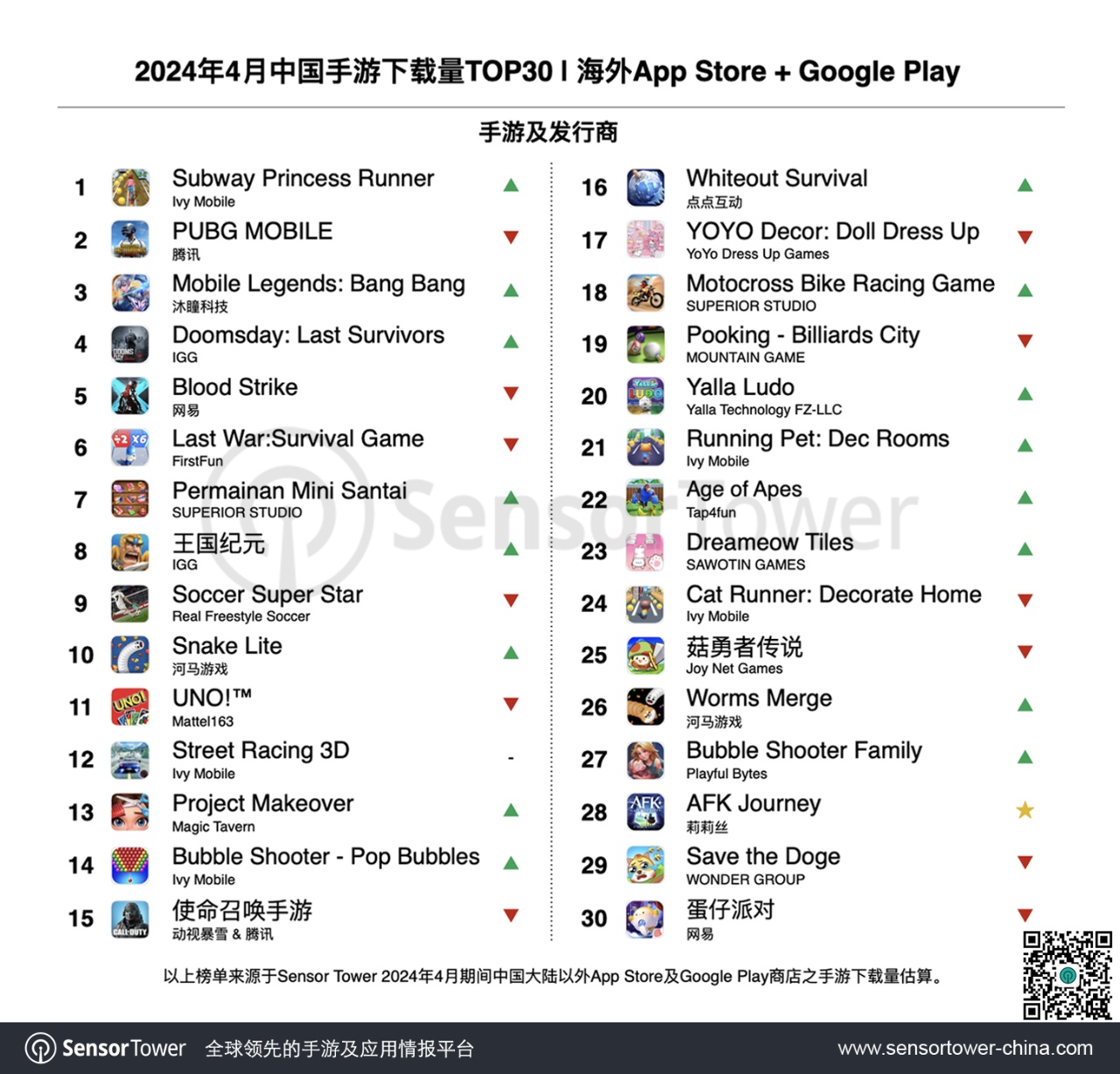 IGG旗下4X策略手游《Doomsday: Last Survivors》4月下载量环比提升36%,排名上升10位至下载榜第4名。