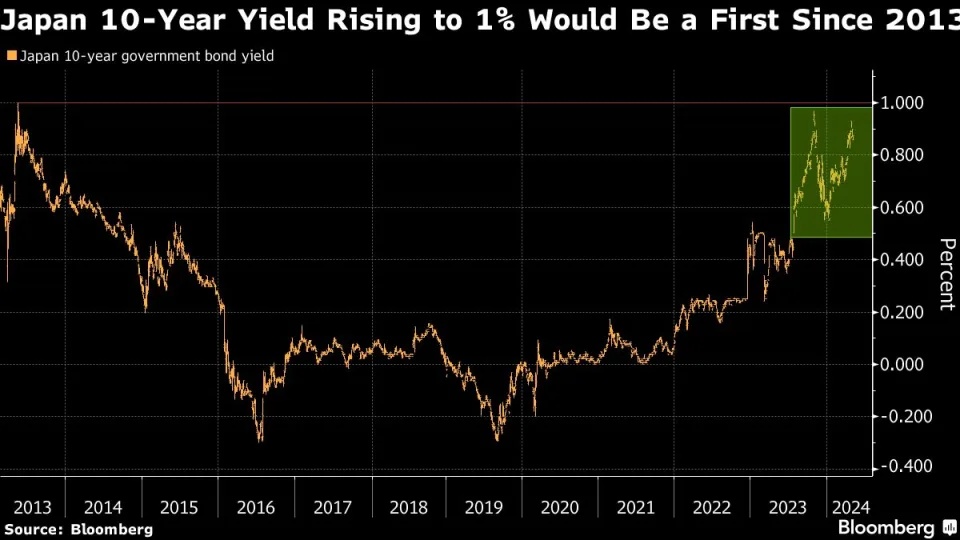 分析师预计日本央行决策者最早可能在6月的下次会议上采取某种行动,交易员预计基准的日本10年期政府债券收益率可能突破1%,尽管这仍低于目前几乎所有其他主要经济体的10年期国债收益率。日本的利率自2013年5月以来从未触及过1%,当时日本央行前行长黑田东彦开始激进的货币宽松政策以克服通缩。