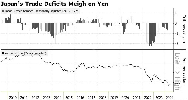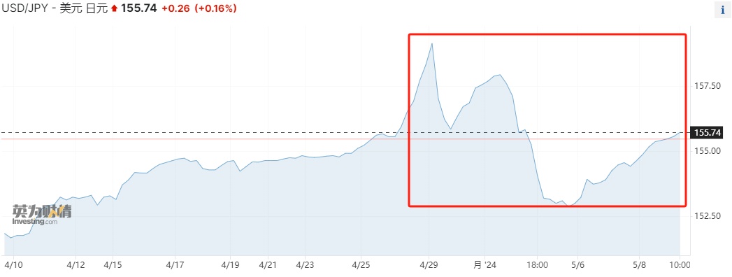 日元汇率自4月26日以来剧烈波动,日本央行当时公布了“鸽意满满”的利率决议,并未涉及市场瞩目的干预外汇问题;随后日元开始遭到重挫。而在度过周末以后,日元在4月29日(周一)更是自1990年以来首次跌破160重要关口,但随后却在午盘阶段短短30分钟内戏剧性地一路暴涨了近400点,日元波动幅度几乎与2022年日本干预时一样大。