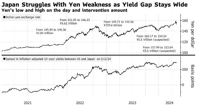 RBC Capital Markets驻新加坡的亚洲外汇策略主管Alvin Tan也认为,由于利率差距,日元可能会跌至160,如果美国利率不下降,“干预的影响将很快消散”。Tan也指出,美元兑日元将重新测试160的水平。