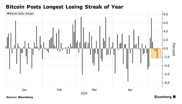 比特币已经连续五天下跌,这将是自去年10月以来持续时间最长的一次下跌。根据CoinGecko和汇编数据显示,比特币在3月中旬一度创下73798美元的历史新高,但此后整个加密货币市场暴跌17%,至2.4万亿美元。