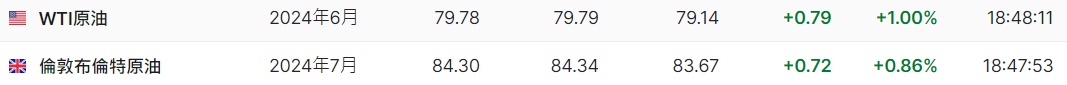 3. 截至发稿,WTI原油涨1.00%,报79.78美元/桶。布伦特原油涨0.86%,报84.3美元/桶。