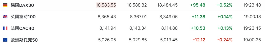 2. 截至发稿,德国DAX指数涨0.52%,英国富时100指数涨0.14%,法国CAC40指数涨0.13%,欧洲斯托克50指数跌0.24%。