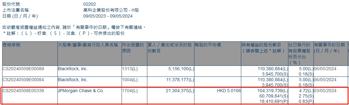 智通财经APP获悉,香港联交所最新资料显示,5月3日,小摩减持万科企业(02202)2130.4375万股,每股作价5.0106港元,总金额约为1.07亿港元。减持后最新持股数目约为1.04亿股,最新持股比例为4.72%。