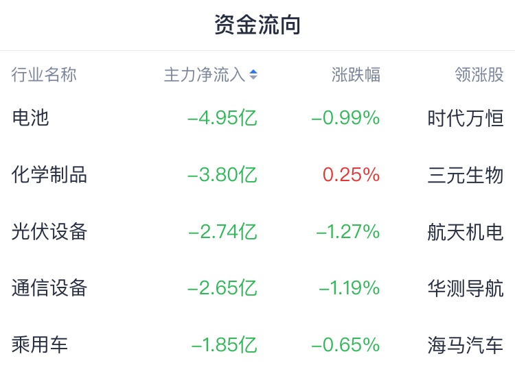 主力资金方面,资金出逃电池、化学制品、光伏设备等行业;资金青睐贵金属、工业金属、家电、白酒等行业。