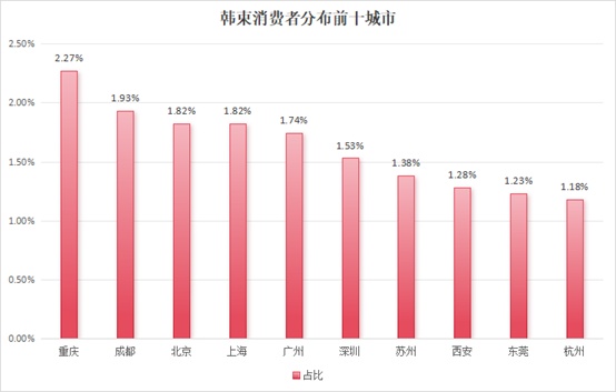 此外,援引公开报道,近一年,韩束在抖音平台上来自一线、新一线和二线城市的消费人群占比总计高达41.58%。消费者分布前十城市依次为:重庆、成都、北京、上海、广州、深圳、苏州、西安、东莞、杭州。