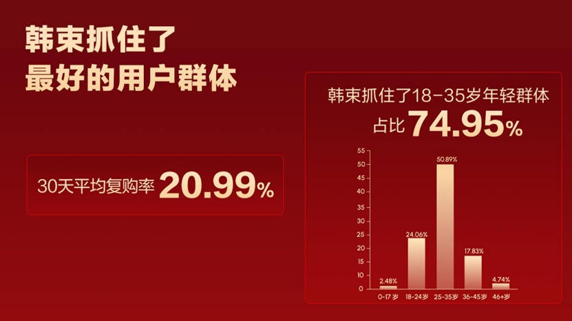 除了在一线、新一线和二线城市的消费人群占比高达4成之外,韩束18-35岁年轻群体占比则高达74.95%。这一年龄层的群体也正是美妆的核心用户。另外一个数据显示,韩束30天平均复购率达20.99%,远超同行平均水平。