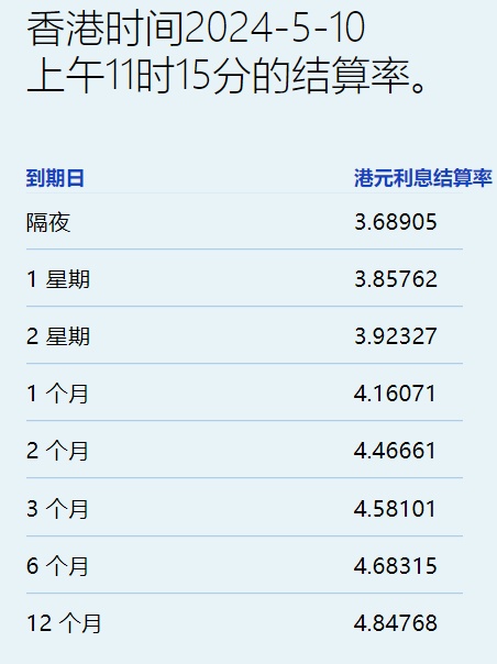 智通财经APP获悉,5月10日,港元拆息个别发展,隔夜息结束两连升,报3.68905%,一周拆息亦微跌,但与楼按相关的一个月拆息连升两天,报4.16071%。反映银行资金成本的三个月拆息结束四连跌,报4.58101%。六个月及一年期分别升至4.68315%和4.84768%。