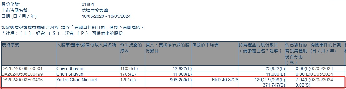 智通财经APP获悉,香港联交所最新资料显示,5月3日,总裁俞德超减持信达生物(01801)90.625万股,每股作价40.3726港元,总金额约为3658.77万港元。减持后最新持股数目约为1.29亿股,最新持股比例为7.94%。