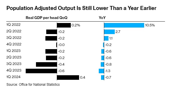 Bloomberg Economics经济学家Ana Andrade表示:“第一季度的GDP增长给我们的观点增加了上行风险,即英国从近两年的停滞中复苏将受到抑制。假设未来几个月整体通胀率降至2%,我们认为这不会阻碍英国央行最早在6月份降息。不过,如果目前的势头得以维持,迟早会增加经济中的通胀压力。这可能会促使央行的宽松程度低于我们的预期。”