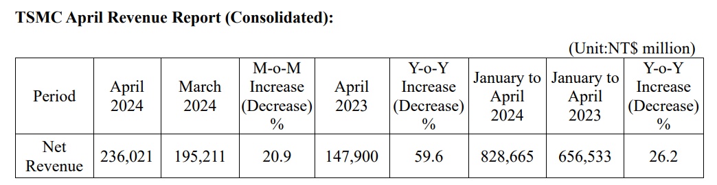 智通财经APP获悉,台积电(TSM.US)今日公布,2024 年 4 月营收 2360.2 亿元新台币,环比增长 20.9%,同比增长 59.6%。