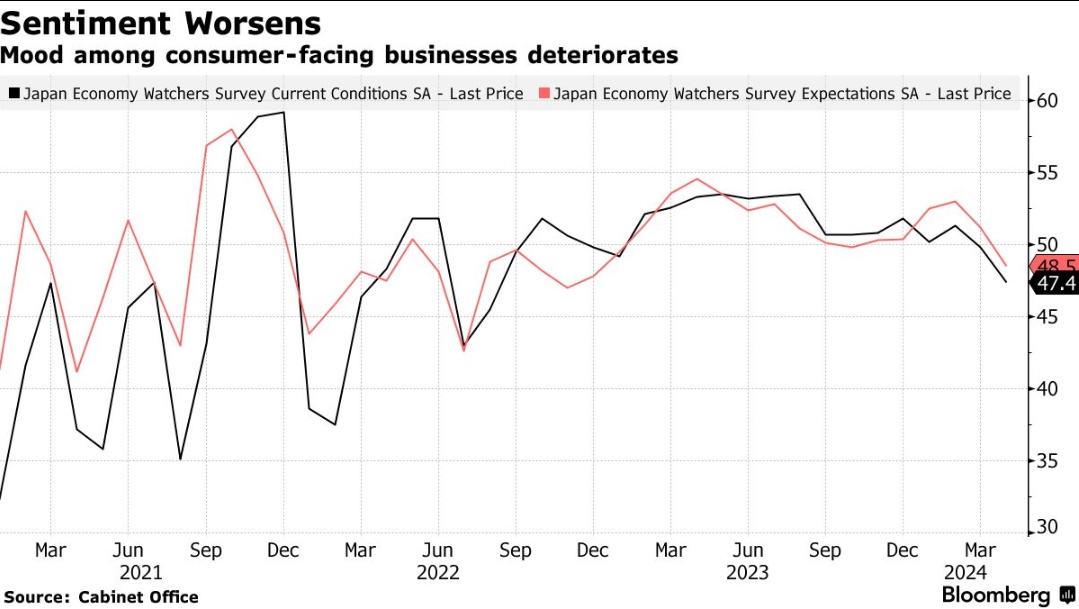 智通财经APP获悉,日本商业信心在4月份遭遇重挫,降至20个月以来的最低点,主要原因是市场对日元贬值带来的进口成本上升和消费者压力的担忧加剧。根据日本内阁府经济观察者的最新调查,涉及零售、交通等多个领域的商业情绪指数在上个月下降了2.4点,至47.4点,这是自2022年8月以来的最低记录。