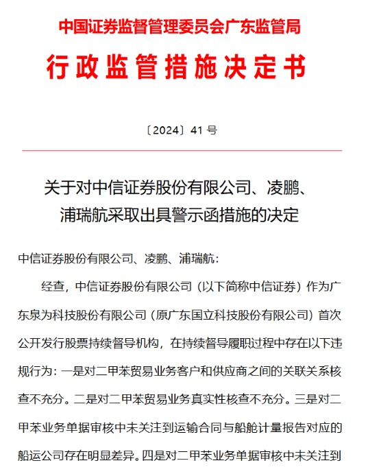 智通财经APP获悉,5月10日,广东证监局发布关于对中信证券股份有限公司、凌鹏、浦瑞航采取出具警示函措施的决定。经查,中信证券股份有限公司(以下简称中信证券)作为广东泉为科技股份有限公司(原广东国立科技股份有限公司)首次公开发行股票持续督导机构,在持续督导履职过程中存在以下违规行为:一是对二甲苯贸易业务客户和供应商之间的关联关系核查不充分。二是对二甲苯贸易业务真实性核查不充分。三是对二甲苯业务单据审核中未关注到运输合同与船舱计量报告对应的船运公司存在明显差异。四是对二甲苯业务单据审核中未关注到销售合同和租船合同约定的装货港存在明显异常。