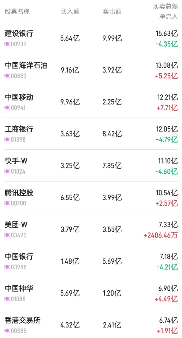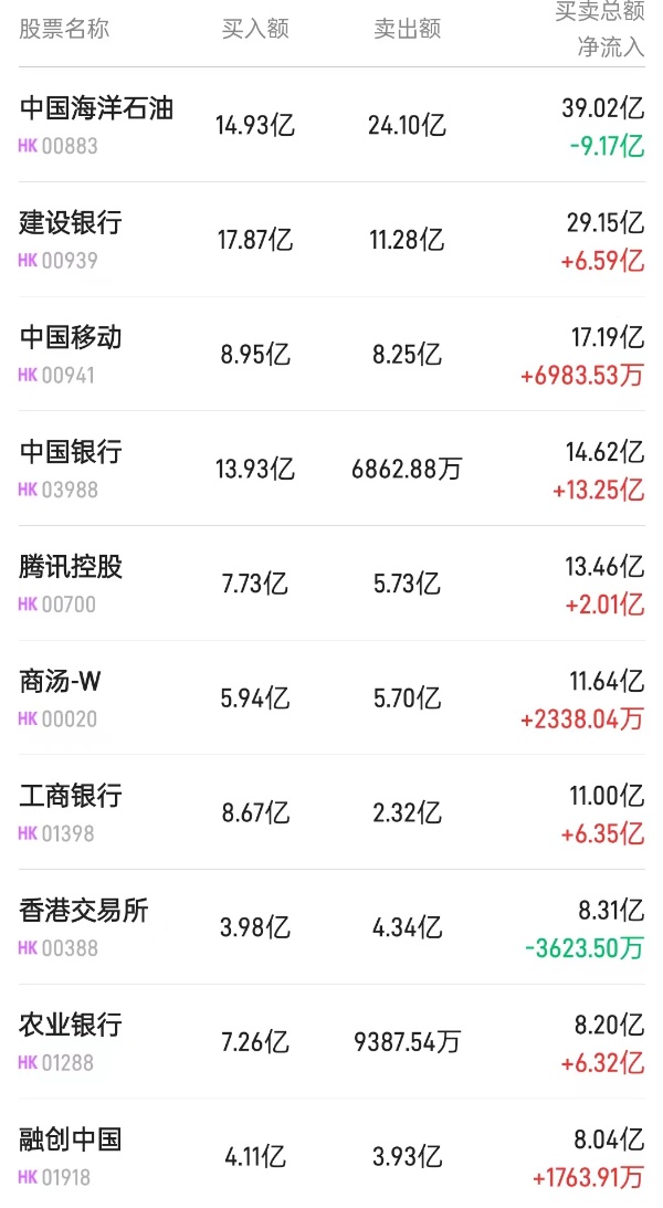 北水净买入最多的个股是中国银行(03988)、中国移动(00941)、农业银行(01288)。北水净卖出最多的个股是中海油(00883)。