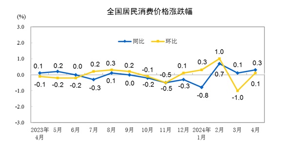 4月份,全国居民消费价格环比上涨0.1%。其中,城市上涨0.1%,农村持平;食品价格下降1.0%,非食品价格上涨0.3%;消费品价格下降0.1%,服务价格上涨0.3%。