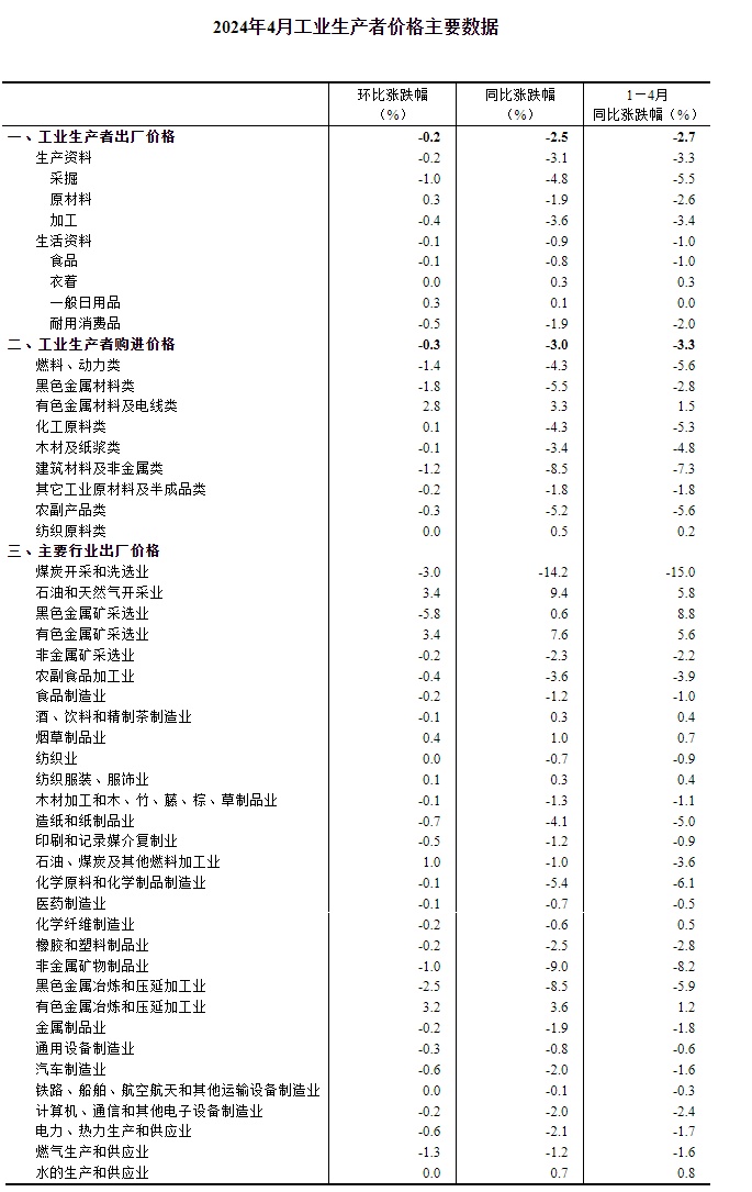 智通财经APP获悉,5月11日,国家统计局发布数据显示,2024年4月份,全国工业生产者出厂价格同比下降2.5%,工业生产者购进价格同比下降3.0%,降幅比上月分别收窄0.3、0.5个百分点;工业生产者出厂价格和购进价格环比分别下降0.2%、0.3%。1—4月平均,工业生产者出厂价格比上年同期下降2.7%,工业生产者购进价格下降3.3%。