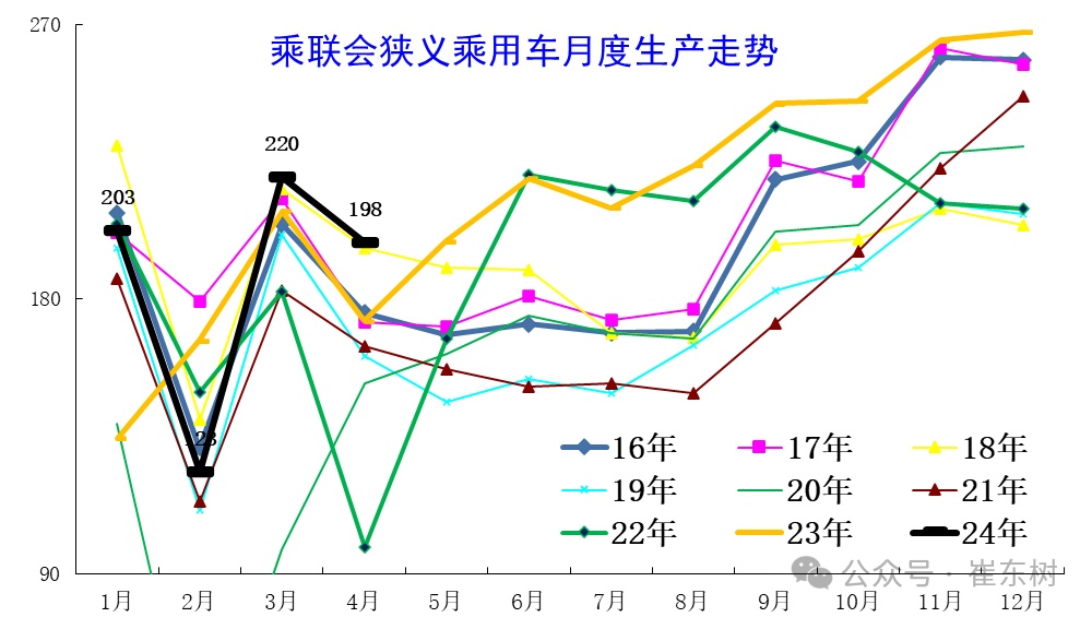 4月乘用车生产198万辆,同比增长15%,环比下降10%。