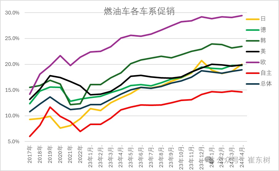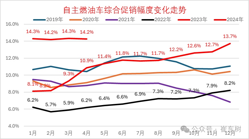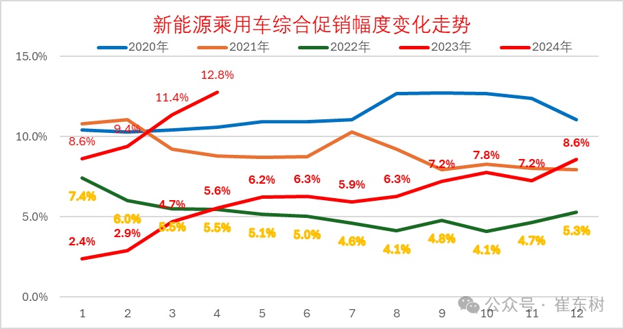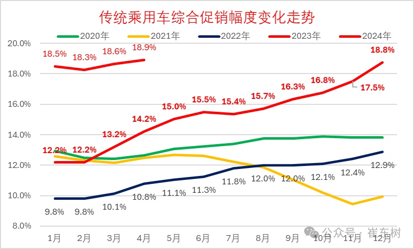 传统燃油车的促销在2023年8月又开始大幅反弹,2024年4月上升到18.9%,目前仍处于近期高位水平。