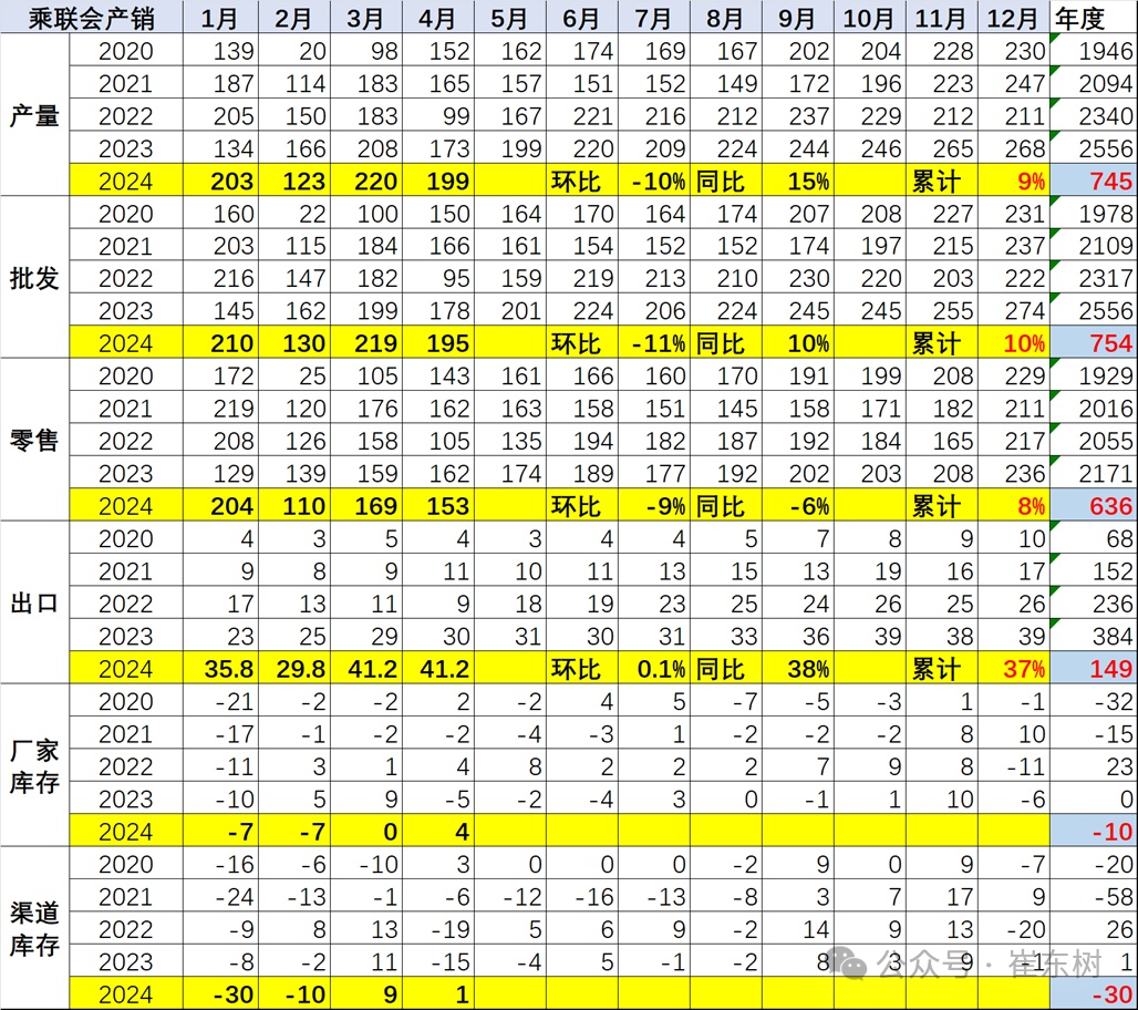 由于4月厂商生产和出口创新高,但零售偏弱,形成了厂商产量高于批发4万台,而厂商国内批发高于零售1万辆的加库存走势。厂商与渠道3月开始加大,4月一般是去库存特征,今年因五一备库存而稍高,厂商库存仍需要合理控制。