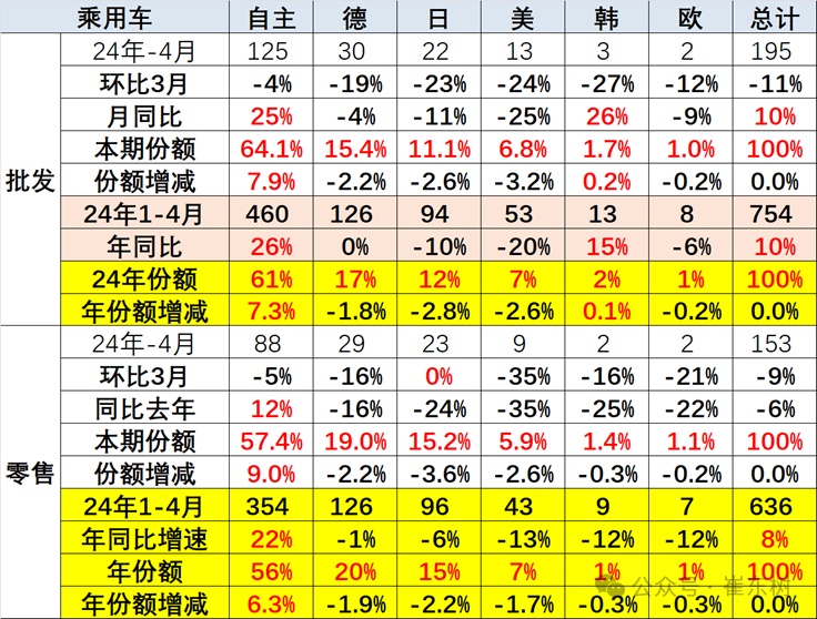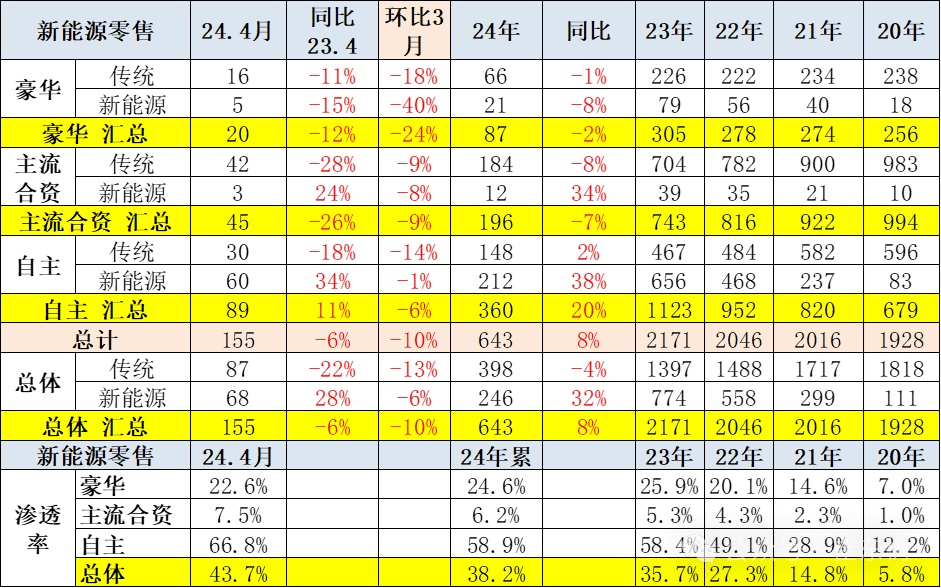 4月传统车零售同比下降22%,而新能源车零售同比上升28%,均压力较大。