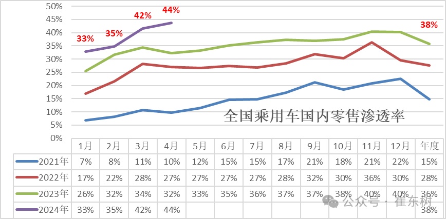 4月新能源车国内零售渗透率43.7%,较去年同期32%的渗透率提升11.7个百分点。