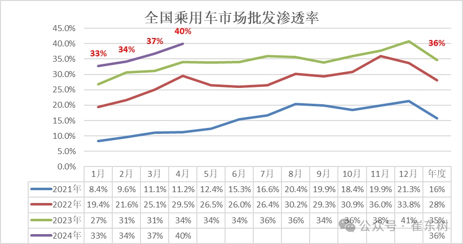 4月新能源车厂商批发渗透率40%,较2023年4月的34%的渗透率提升6个百分点。