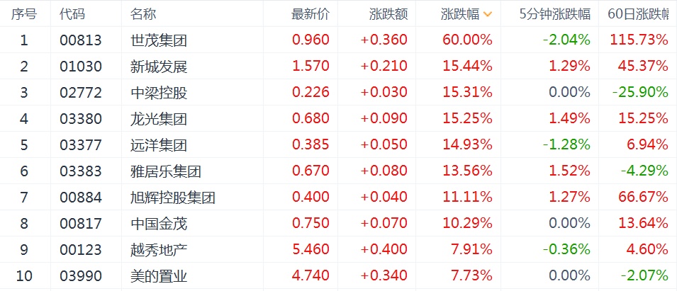 近日以来,港股和A股两地的地产板块屡获资金追捧,涨势亮眼。5月10日,AH房地产板块再走强,A股方面,天地源、中交地产、招商蛇口超5只个股涨停,港股方面,内房股板块涨超6%领涨板块,世茂集团(00813)暴涨60%引人注目,新城发展(01030)、中梁控股(02772)、龙光集团(03380)皆涨超15%。