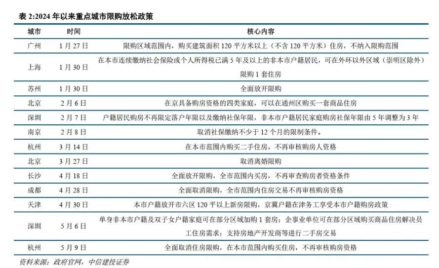 其中,方正证券指出,在国常会与政治局会议指导下,近期多城响应会议号召,全面放松限购,北京、深圳陆续优化限购。当下正处于政策密集放松期,一线城市限购有望持续放松,行业企稳具备政策宽松环境。