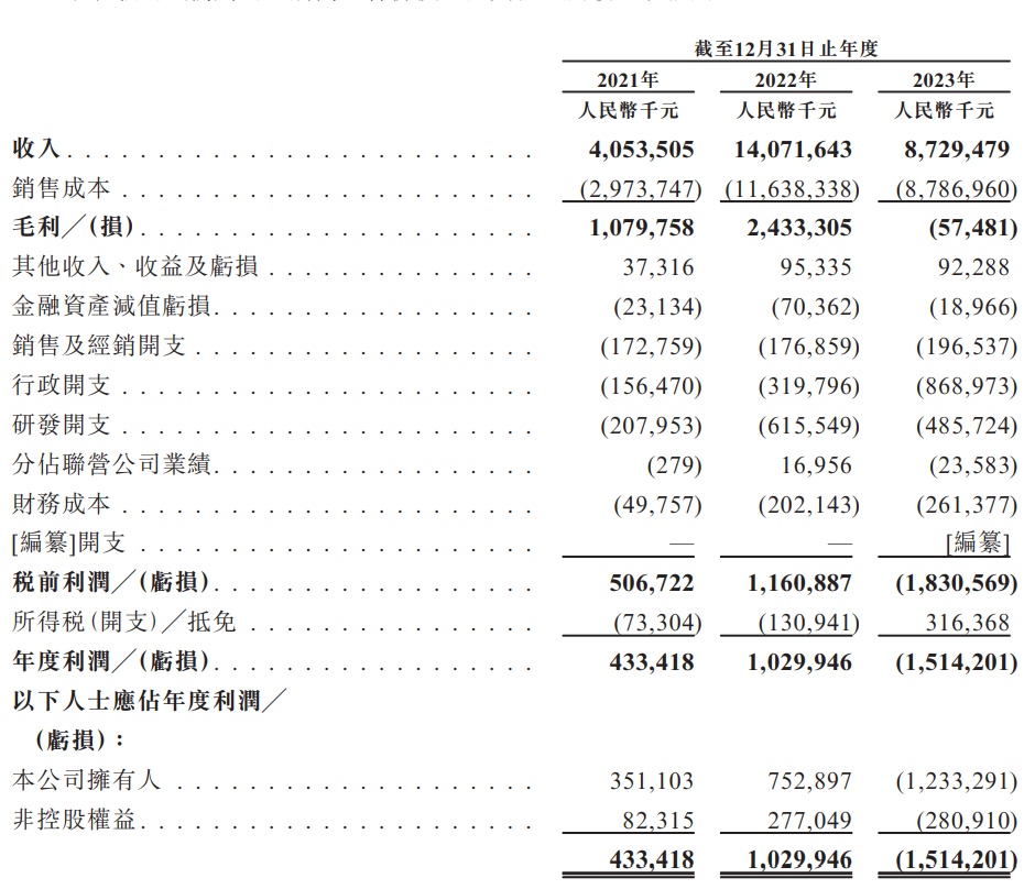 龙蟠科技虽然在磷酸铁锂正极材料行业及车用精细化学品行业的多个细分市场享有主要市场地位,但这并不能“护航”公司稳定盈利。于2021年、2022年、2023年,龙蟠科技实现收入分别为约人民币40.54亿元、140.72亿元、87.29亿元,同期,公司利润分别约为4.33亿元、10.30亿元、-15.14亿元。