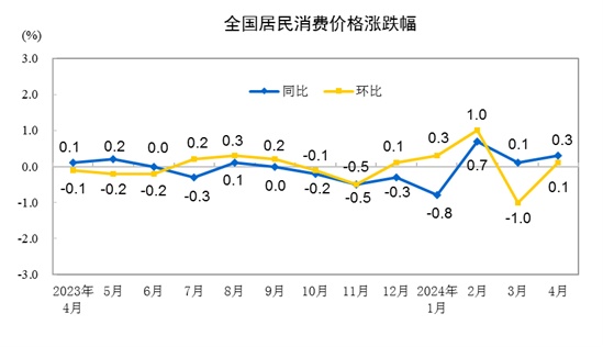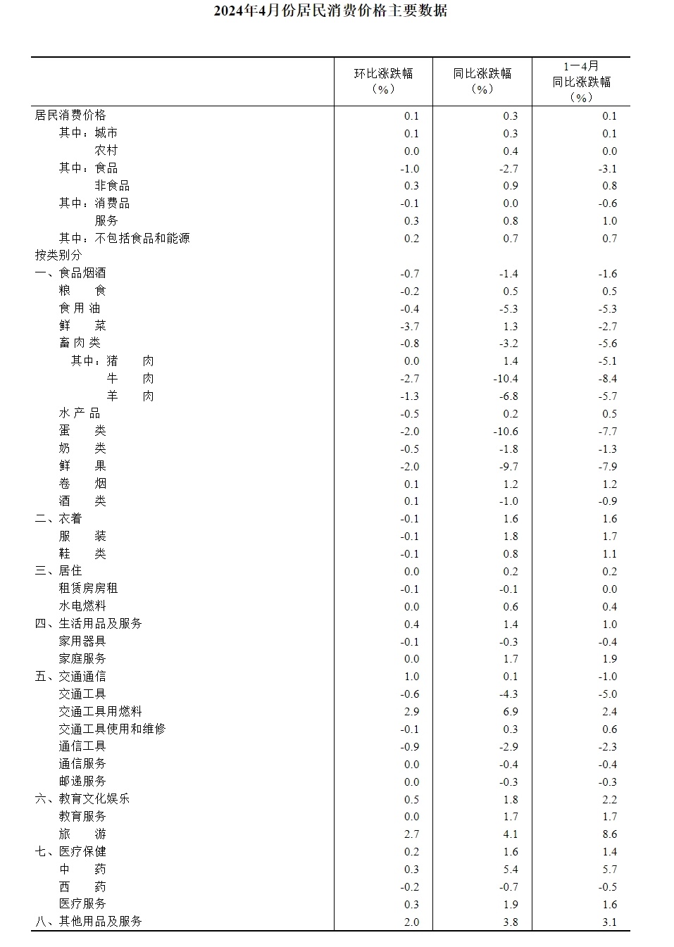 2024年4月份,全国居民消费价格同比上涨0.3%。其中,城市上涨0.3%,农村上涨0.4%;食品价格下降2.7%,非食品价格上涨0.9%;消费品价格持平,服务价格上涨0.8%。1-4月平均,全国居民消费价格比上年同期上涨0.1%。