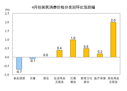 4月份,全国居民消费价格环比上涨0.1%。其中,城市上涨0.1%,农村持平;食品价格下降1.0%,非食品价格上涨0.3%;消费品价格下降0.1%,服务价格上涨0.3%。