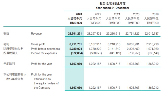 尽管统一积极谋变,但结合近年来的财务表现看,公司的发展成果或许还是用喜忧参半来形容才更贴切。回溯统一企业中国最近五个完整年度的业绩表现,2019-2023年,统一的收入分别为220.2亿元、227.6亿元、252.3亿元、282.6亿元、285.9亿元,归母净利润13.7亿元、16.3亿元、15亿元、12.2亿元、16.7亿元。从业绩变动趋势看,2023年统一的盈利表现刷新了阶段新高,但“硬币的另一面”则是公司收入增速显著回落,规模增长近乎停滞。