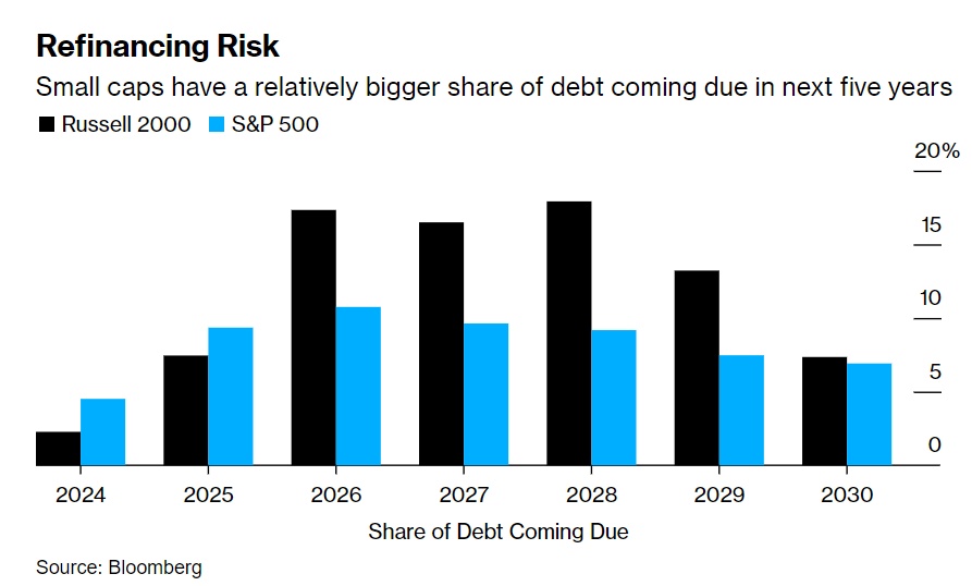 机构汇编的数据显示,美股小盘股基准指数——罗素2000指数成分公司总共持有高达8320亿美元的债务,其中75%(即6200亿美元)需要在2029年之前进行再融资。相比之下,美股基准指数——标普500指数(S&P 500 Index)成分公司中届时的总计到期债务只有不到50%。