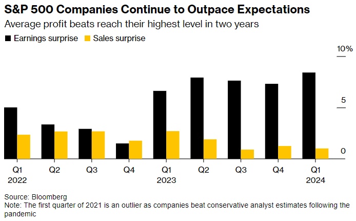 标普500巨头在最新公布的季度收益中表现超出预期,这在一定程度上得益于他们对经济衰退的担忧而采取的降低成本措施。根据数据显示,一季度标普500指数中的459家公司公布的利润平均超出预期8.4%,超出预期的公司比例也从上季度的76%上升到了79%。