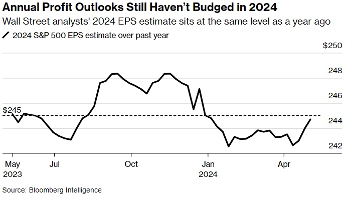 值得注意的是,分析师对2024年全年的盈利预期几乎没有变化,尽管他们上调了第二季度的预期。数据显示,华尔街预计标普500指数成份股公司2024年每股收益约为245美元,与一年前的预测几乎没有变化。