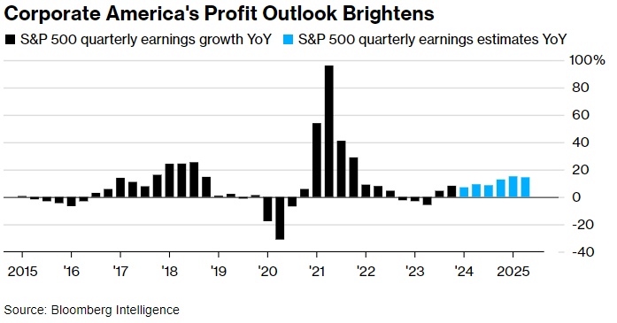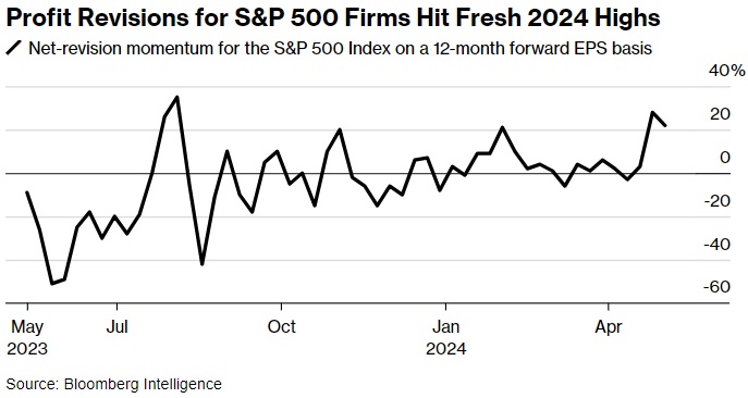 标普500指数公司第一季度有望实现7.1%的收益增长,超过分析师季前预测的3.8%。数据显示,一个受到密切关注的指标——收益修正势头——已达到去年9月以来的最高水平,该指标衡量未来12个月每股预期收益的修正变化。Soong表示,这表明未来几周可能会有更多高于分析师预期上修。