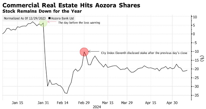 今年2月,青空银行在美国的写字楼房地产贷款组合出现亏损,震惊了市场。在一家日本主动基金成为青空最大股东之一后,该公司也引起了市场的关注;与日本最著名的激进投资者Yoshiaki Murakami有联系的City Index eleven基金已持有该银行8.9%的股份。