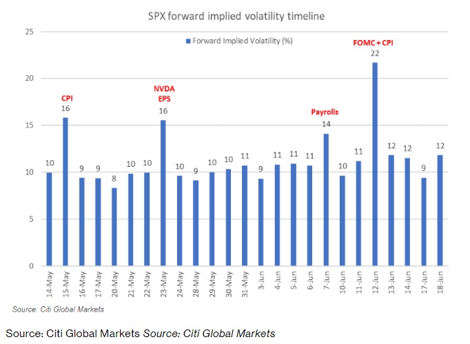 整个市场预测CPI本周公布后的波动将与英伟达(NVDA.US)公布业绩后第二天的幅度相同。这两者隐含的波动幅度大于6月7日美国政府发布下一份非农就业报告后的预测;尽管4月份非农就业意外“爆冷”——雇主缩减了招聘规模,表明劳动力市场在年初表现强劲后正在降温。