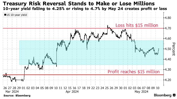 上周晚些时候,5月24日到期的期权进行了一笔大规模的风险逆转交易——如果10年期美国国债的收益率(目前约为4.5%左右)在5月24日之前降至4.25%,那么该低成本头寸将获利约1500万美元。然而,如果10年期国债收益率升至4.7%左右,它也有可能出现高达1500万美元的损失。分析显示,如果10年期美国国债收益率低于4.35%,该头寸就会开始赚钱,如果收益率高于4.58%,该头寸就会亏损,但一旦超过这一水平,利润或亏损就会迅速累积。